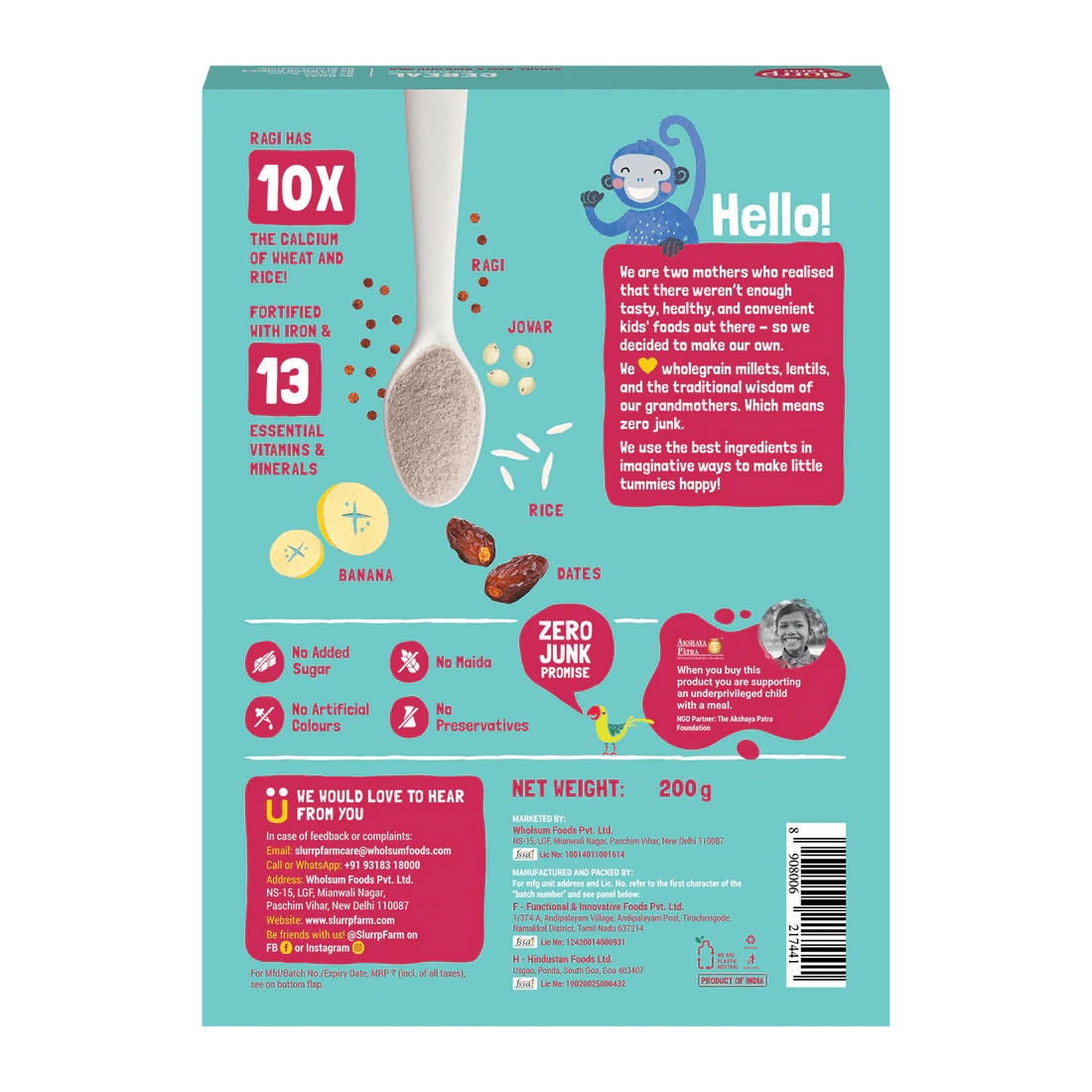 Slurrp Farm cereals are carefully crafted to deliver essential calcium, the goodness of nutrient-rich millets, and the natural taste of real fruits. Packed with vitamins and minerals, each bite supports your child’s growth, strong bones, and overall development — all without any added sugar or preservatives.