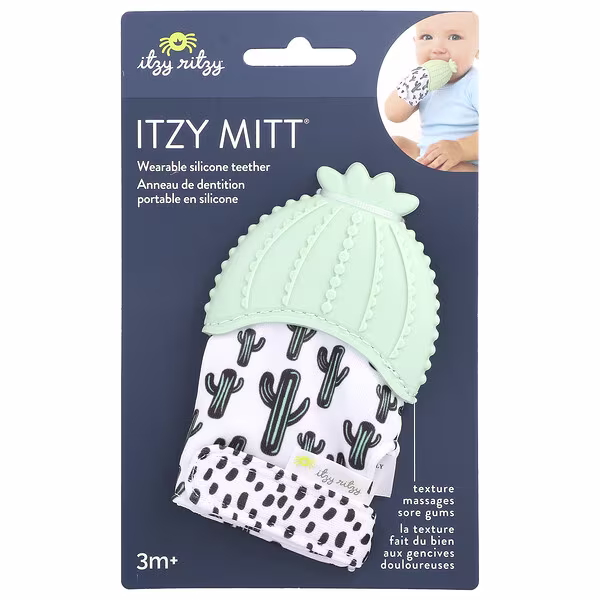 Itzy Ritzy teething mitts are safe on baby’s gums and the glove design keeps baby from getting scratches on his or her face and is also ideal for babies who can’t yet hold a teether. Recommended for ages 3 months+.